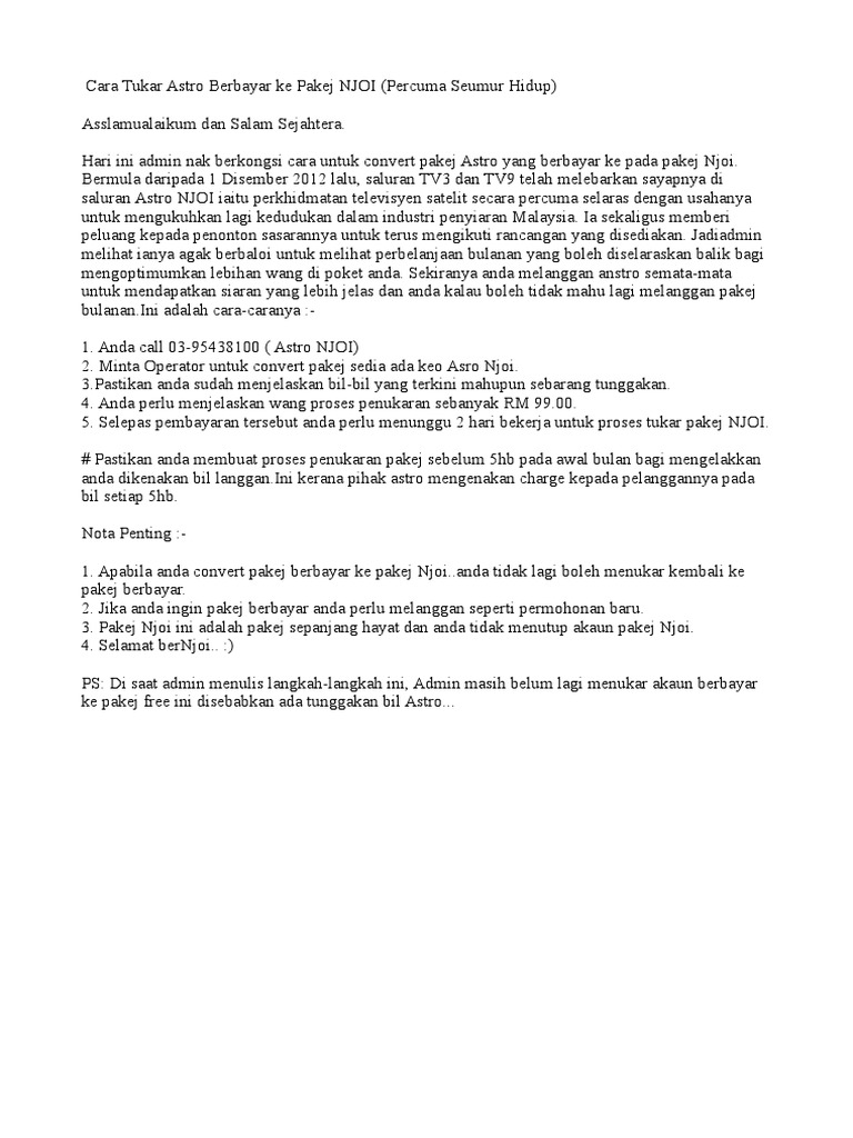 Baca panduan cara tukar package sebagai contoh, untuk mengurangkan kelajuan, kerana pakej astro mahal atau meningkatkan. Pakej njoi ini adalah pakej sepanjang hayat dan anda tidak menutup akaun pakej njoi. Documents similar to cara tukar astro berbayar ke pakej njoi. Macam mana nak tukar pakej astro downgrade/upgrade? Senarai pakej internet rumah terbaik untuk rujukan kita yang tinggal di malaysia.